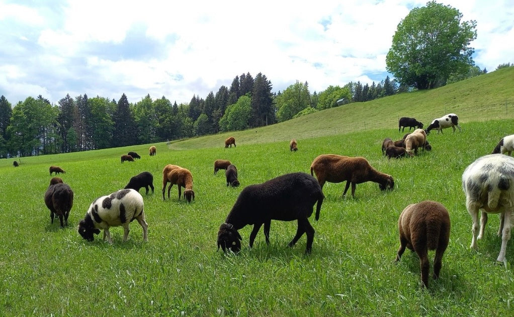 Das Rhönschaf ist eine alte, seltene Landschafrasse aus der Mittelgebirgsregion Rhön. Unverkennbar sind der tiefschwarze, unbewollte Kopf und die weißen Beine. Die Tiere sind robust, anpassungsfähig und ganzjährig weidetauglich. Ihre mittelfeine, strapazierfähige Wolle eignet sich hervorragend für warme Pullover, Decken und Filzarbeiten – und jeder Einsatz unterstützt den Erhalt dieser bedrohten Rasse.