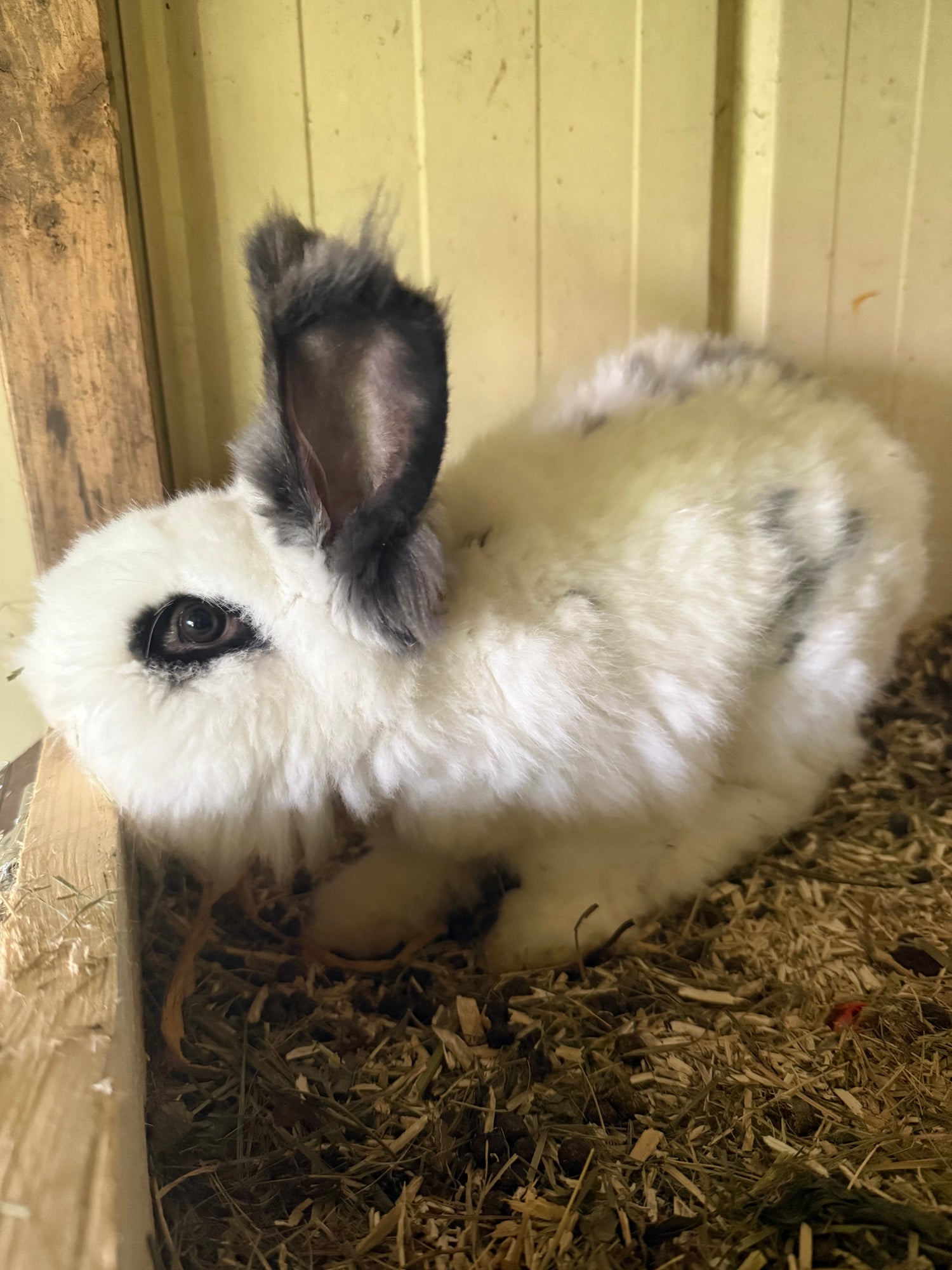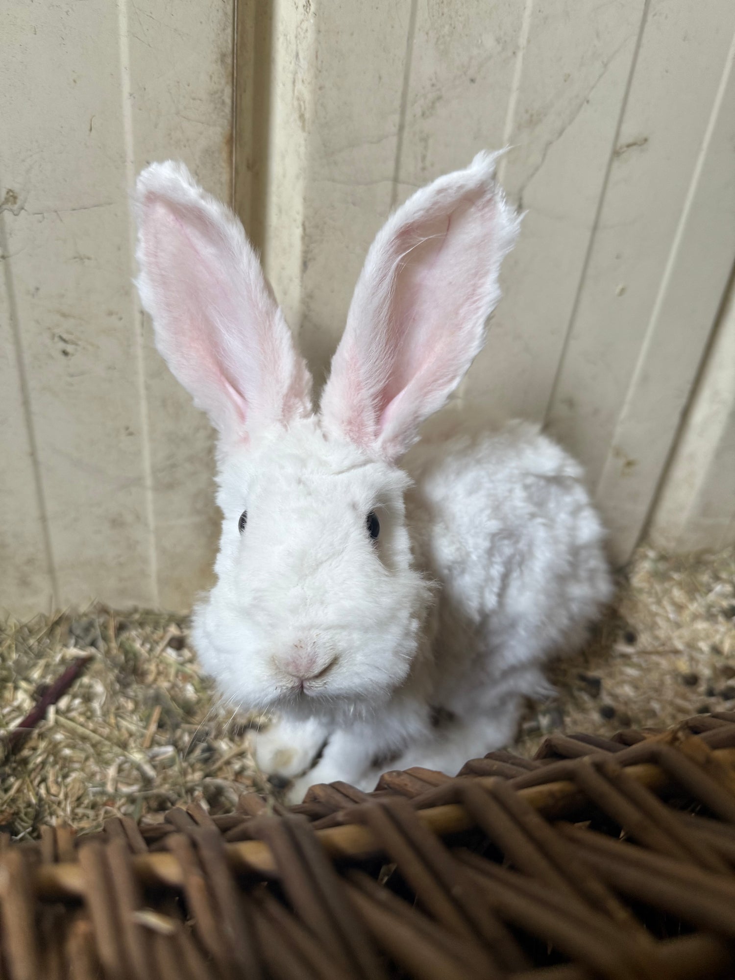 Reines Weiß, sanft wie ein Wintermorgen, mit funkelnden blauen Augen. Snow ist die Ruhe selbst und schenkt mir die feinste Angora-Qualität – kostbar, zart und federleicht.