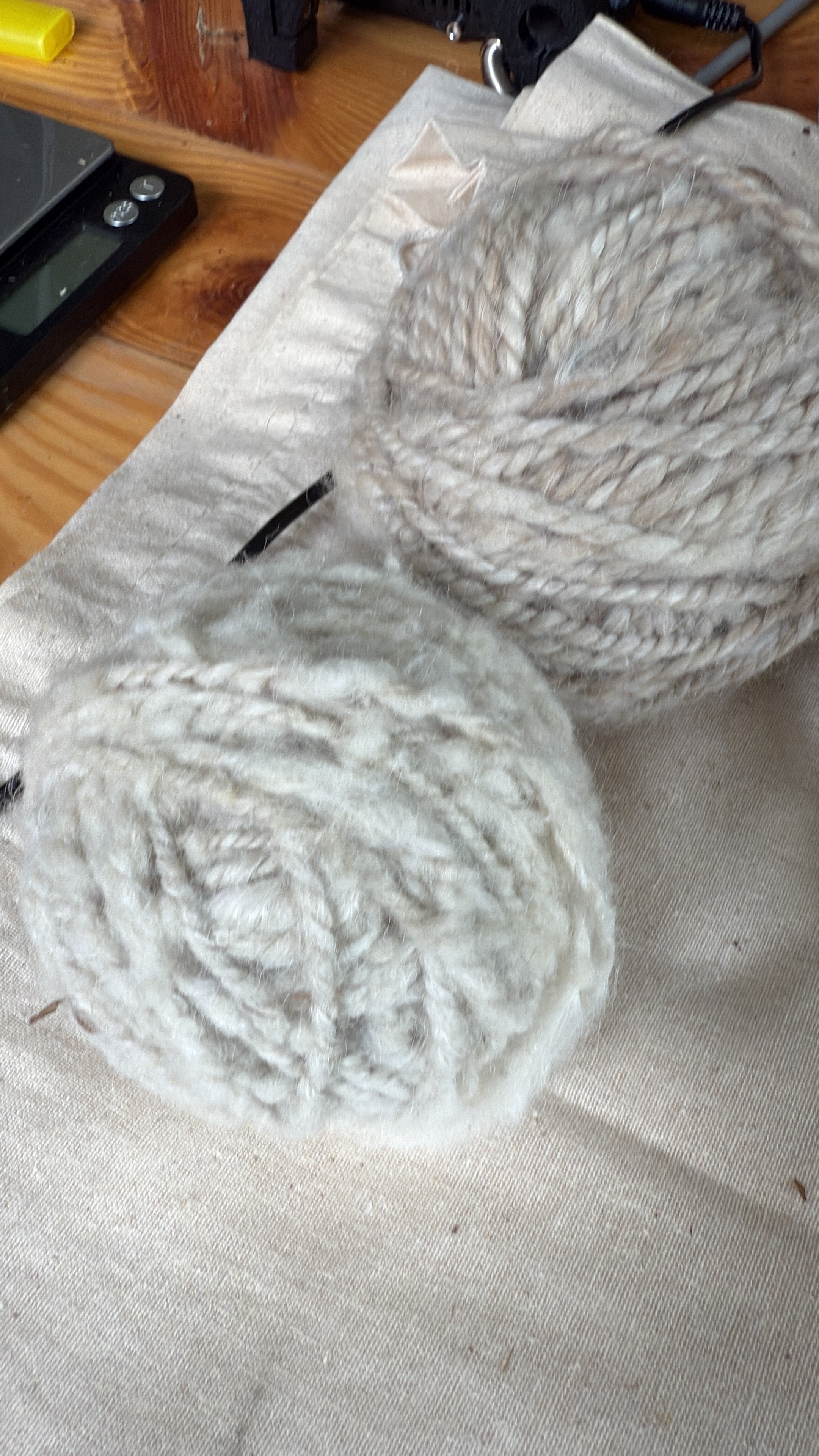 Weiß mit grauen Flecken, voller Energie und kleinen Späßen. Er ist charmant, ungeduldig und immer mittendrin – seine Wolle ist besonders voluminös und ideal für Stücke, die lange begleiten sollen.