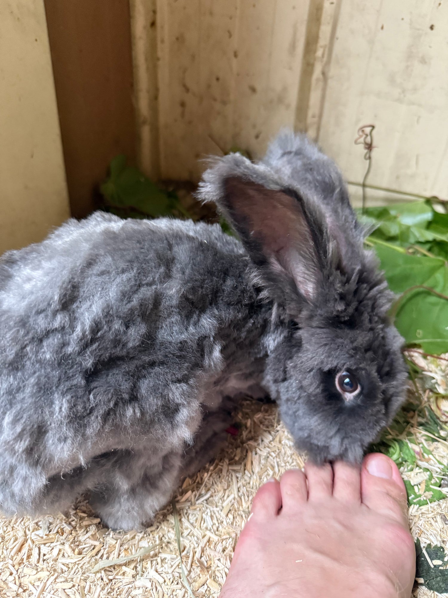 Grauschwarze Angora-Häsin mit glänzendem Fell und wachem Blick. Sie ist vorsichtig, doch wenn sie vertraut, ist sie voller Zuneigung. Ihre Wolle ist warm, dicht und von einer edlen Tiefe.